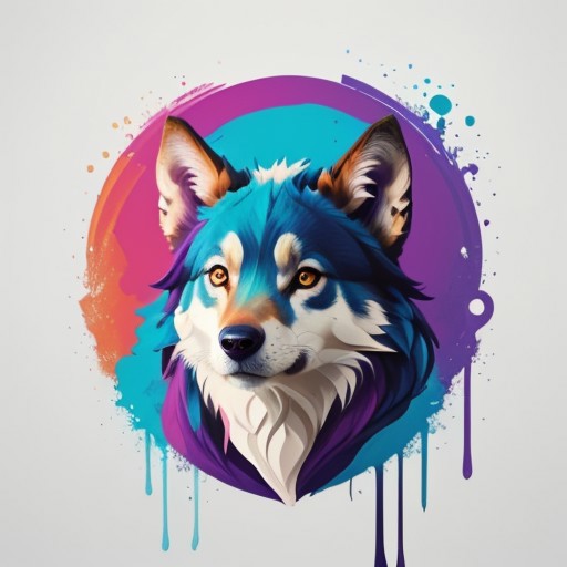 a stylized painting of a animal, vibrant color, best quality, masterpiece, epic, flowing, purple and pink and blue paint, legendary, mythical, head shot, T shirt design,TshirtDesignAF, tshirt design, simple background, white background, flat background,