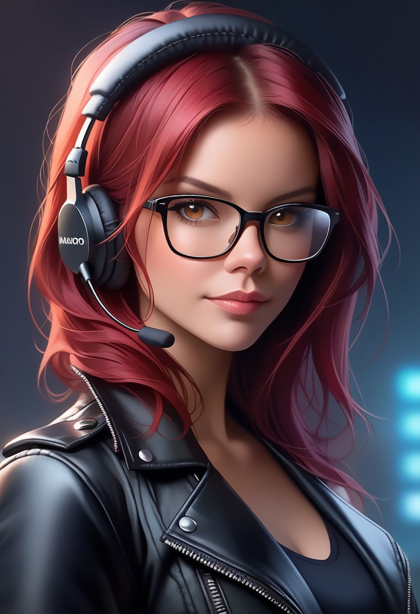 A realistic portrait of a woman in a leather jacket, posing with a headset in her ear. The dark, matte texture of her jacket contrasts with the soft lighting that highlights her glasses and sharp features. The muted background emphasizes her confident gaze and poised demeanor, adding depth to the composition. namora