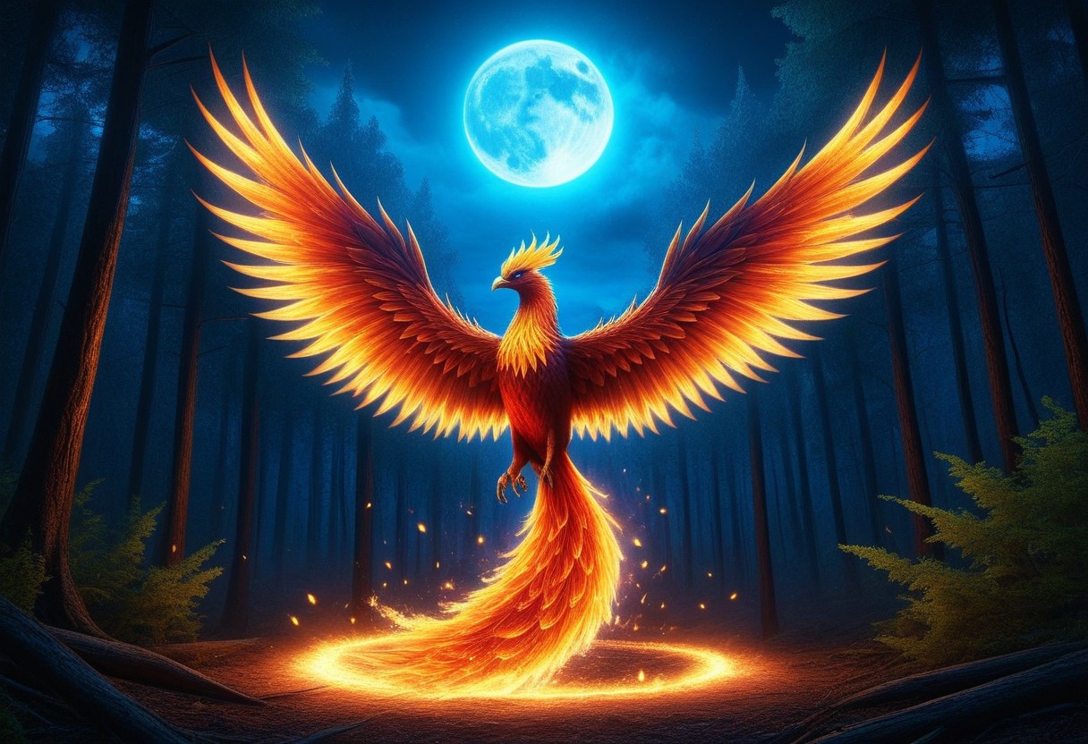 A mystic phoenix Flying in the sky, flying:1.4 in Pencil_morph_style, ,fiery colors, deep red, electric blue, molten gold edges, , wings spread wide, leaving a trail of glowing embers, magic circle, aura, spell flame, forest, night time, moon ,stormy sky, dramatic backlight, high contrast, ,cinematic lighting, ultra-detailed, photorealistic, trending on ArtStation, 8K, masterpiece, octane render, volumetric fire.