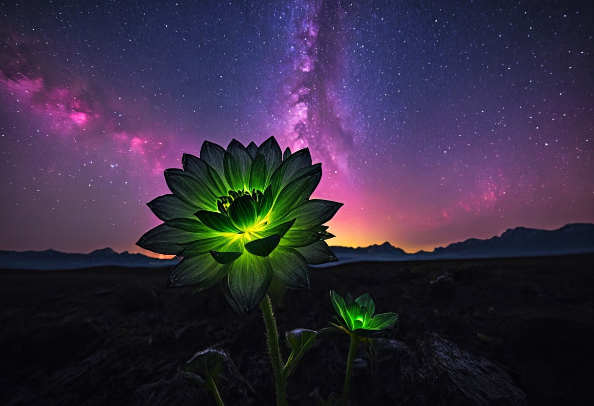 rp_slgd, flower, dramatic light, night, milky way, star sky, glowing, aurora, trippy,