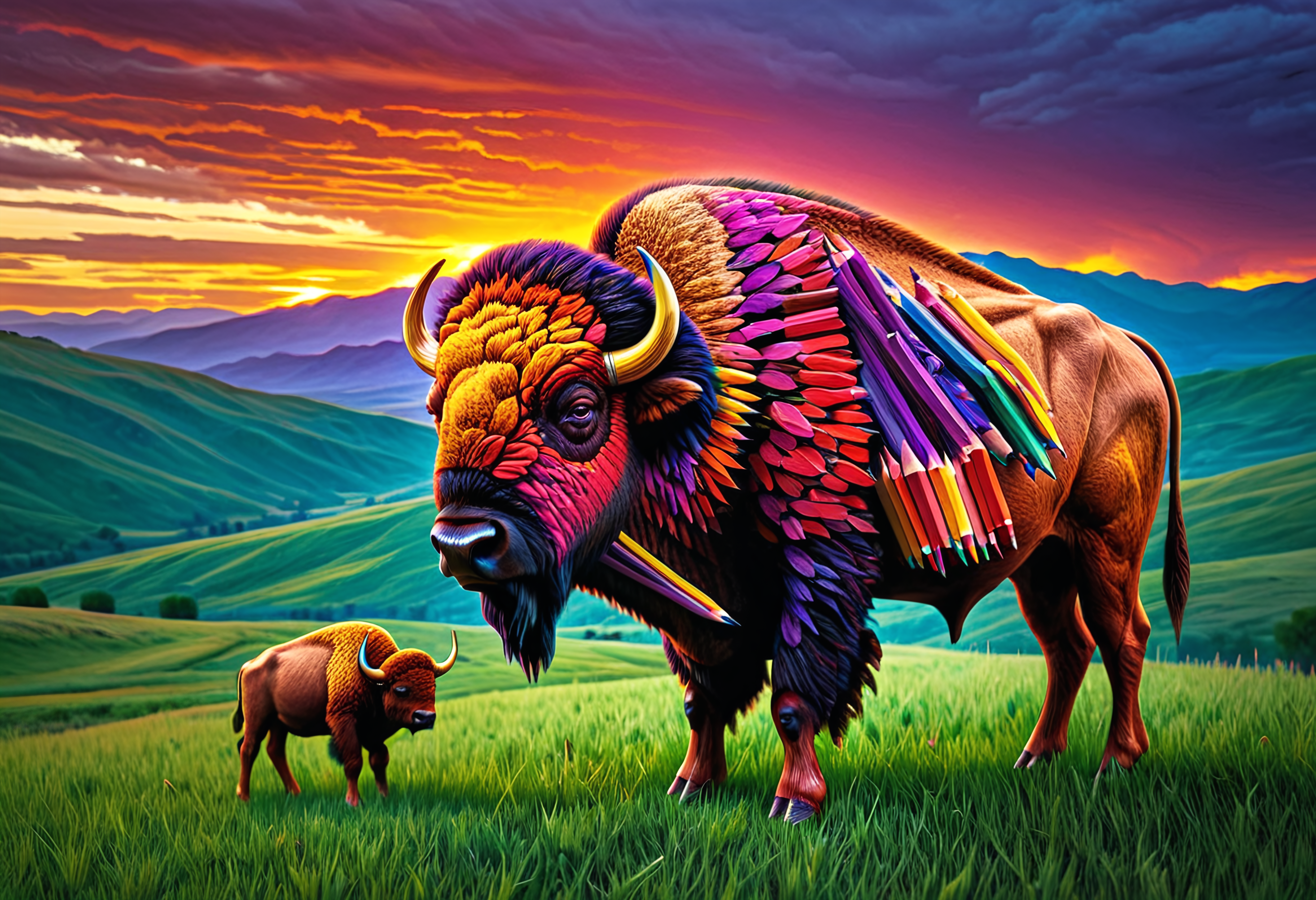 Masterpiece, best quality, very aesthetic, absurdres, cinematic nature photography, a vibrant colored Pencil_morph_style American buffalo, bison made of pencils, fur made of brown pencil, majestic, on a green pencil plain, a dramatic sunset of red and gold and purple over distant rolling hills, detailed photograph. <lora:Pencil_morph_style:1> <lora:zavy-cntrst-sdxl:1> chiaroscuro