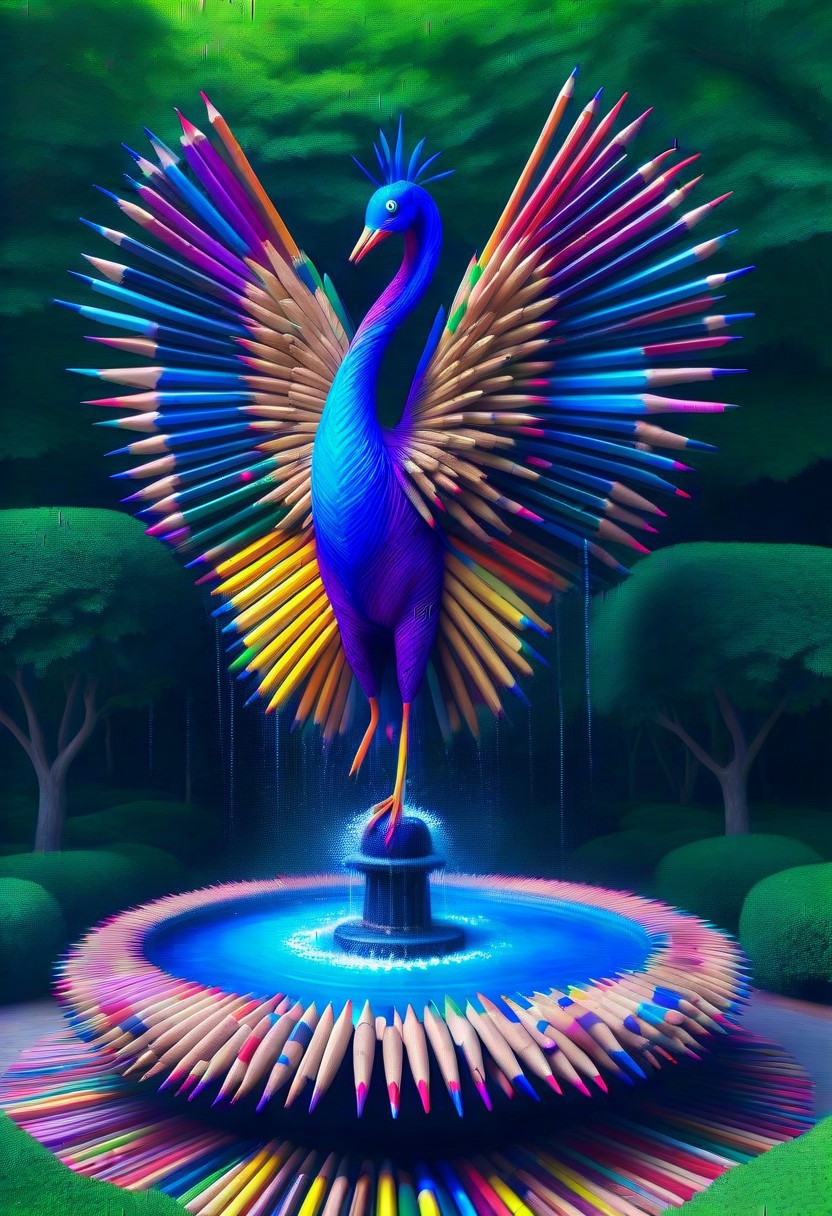 score_9, score_8_up, score_7_up,Pencil_morph_style, jsbw style, artistic, a fountain, no humans, colorfull crane made of pencils, sharp edges, magical orchard background, shadows ,