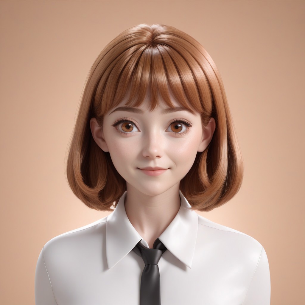 3d rendering, front view, portrait, 1female, adult woman, pale skin, brown hair, smiling:1.5, eye contact, looking at viewer, eye contact, white shirt, smart shirt, solid background, pastel orange background, 3DMM