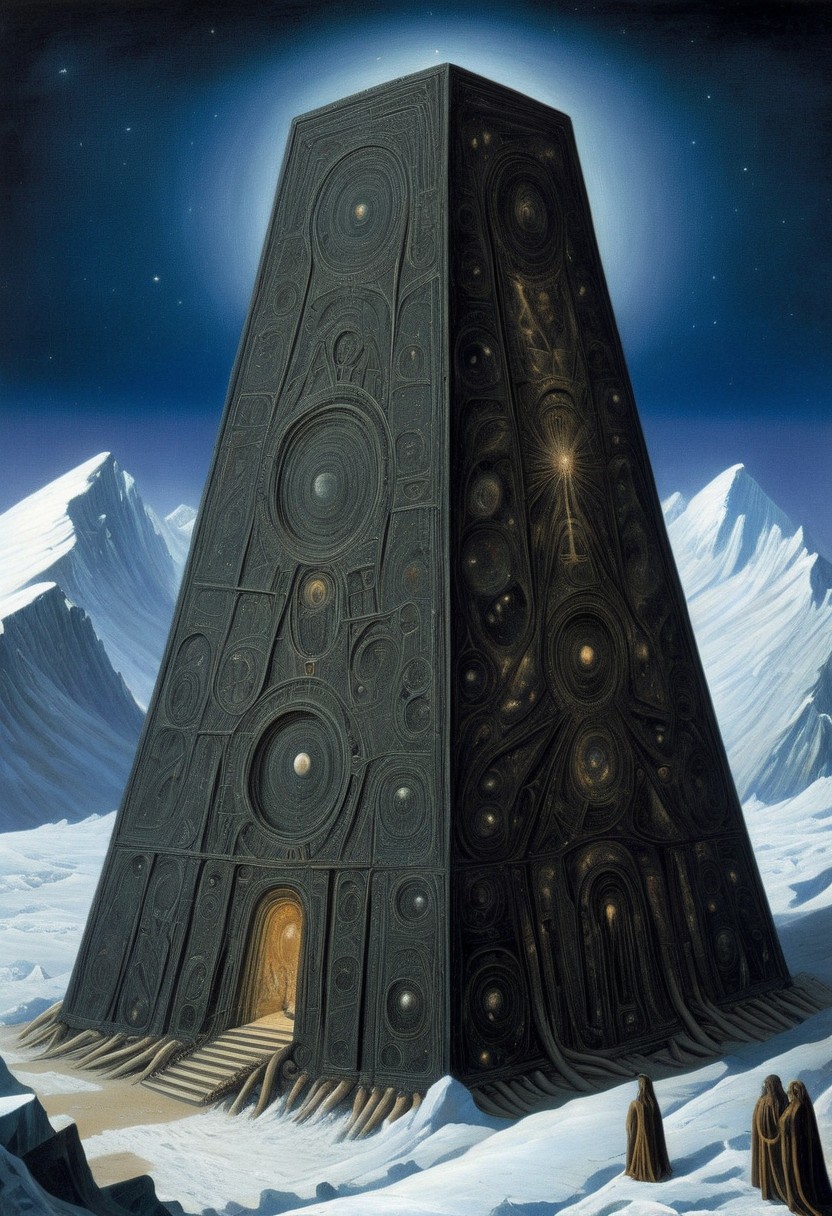 The lovecraftian depiction of the unimaginable inevitable endless cosmic horror coming from the deadly void of space in the form of the giant irritating ethereal indescribable ancient non-euclidean monolith as a shadow of the unknown vanished civilization hidden in the cold antarctic dreadful valleys, high quality, detailed, intricate details, masterpiece, bleak, classic art, oil painting, by paul delvaux, pencil morph style