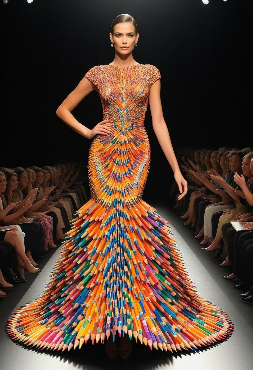 masterpiece, highres, high detail, Pencil_morph_style A vibrant fashion show scene showcasing a stunning model strutting down the runway in a unique dress made entirely of colorful pencils. The dress is intricately designed, with pencils arranged in a cascading pattern that creates a flowing silhouette. The model has a confident expression, and her hair is styled elegantly to complement the artistic theme. The background features flashing cameras and an audience in awe, capturing the creativity of this one-of-a-kind fashion piece.