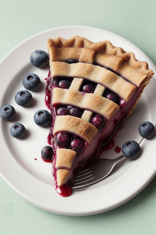 Slice of blueberry pie, white plate, green checkered background, photorealistic