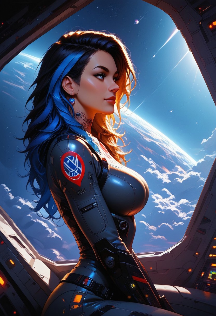 (score_9, score_8_up, score_7_up), 1girl, solo, eyes open, big eyes, cute face, long hair, two tone hair, 20 years old, bangs, curvy, breasts, space suit, neck tattoo, gloves, detailed background, space ship, inside, volumetric lighting, vivid colours, side view, cowboy shot, sitting on chair, driving spaceship, looking away, turned away,