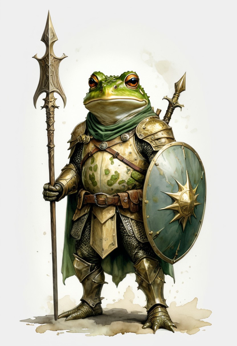 toad fantasy warrior, green toad, toad in armor, mace and shield, morningstar, tower shield armed with spear, magical toad, line art, watercolor wash, simple background, white background, stand, approaching perfection, pure form, golden ratio, minimalistic, concept art by Brian Froud and Carne Griffiths, intricate details, 8k post production, high resolution, hyperdetailed, trending on artstation, sharp focus, studio photo, intricate details, highly detailed, by greg rutkowski<lora:xl_more_art-full_v1:0.5> dungeon and dragon, fantasy, detailed_eye_model unfinished,