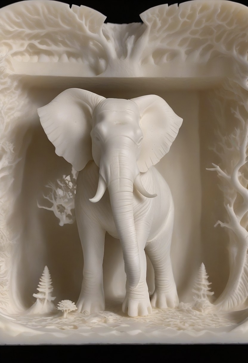 masterpiece, art style, WhiteMold, elephant, ultra detailed, 3d printed mold, no humans, nobody, black background