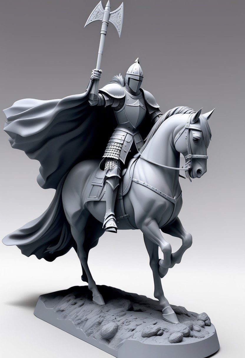 masterpiece, art style, WhiteMold, knight, holding a poleaxe, riding a horse, cape, ultra detailed, 3d printed mold, no humans, nobody, black background