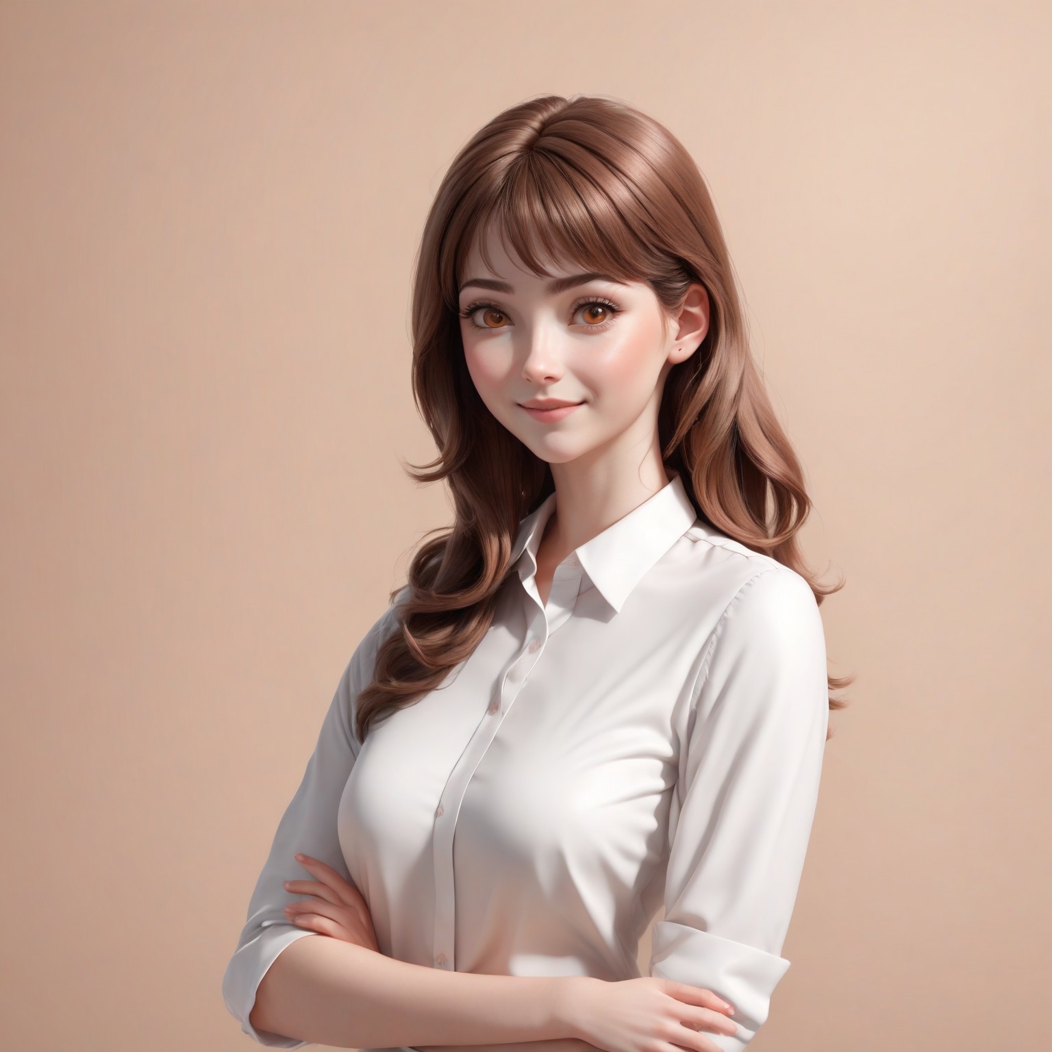 3d rendering, front view, portrait, 1female, adult woman, pale skin, brown hair, smiling:1.5, eye contact, looking at viewer, eye contact, white shirt, smart shirt, solid background, pastel orange background, 3DMM