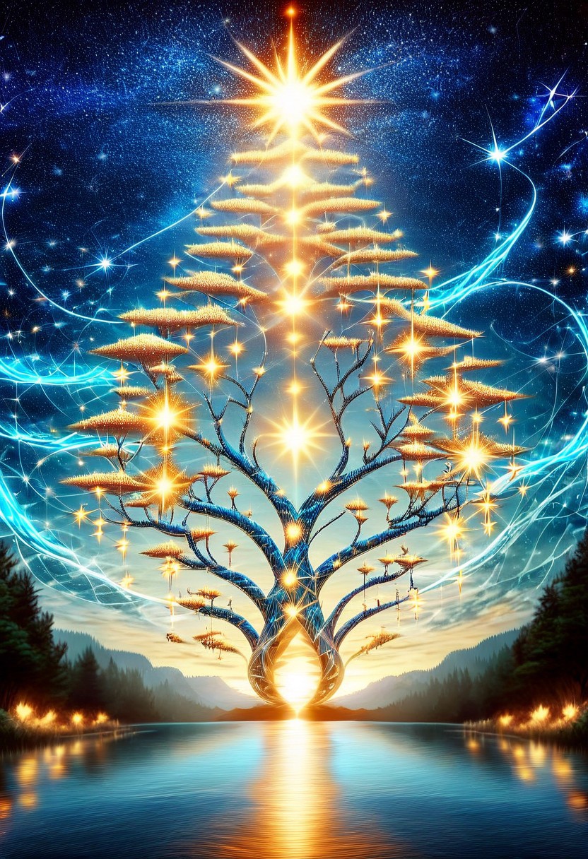 hyper detailed, water horizon, divine tree emerges from water, encircled tree, spiral , golden glow, golden lake, golden dust, sparkles, glitter midjourneyv6.1, starry_morph