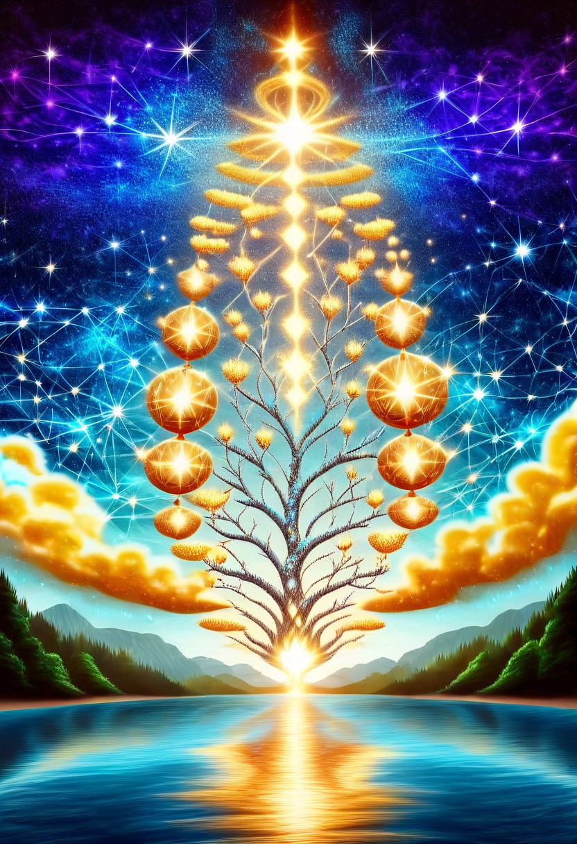 hyper detailed, water horizon, divine tree emerges from water, encircled tree, spiral , golden glow, golden lake, golden dust, sparkles, glitter midjourneyv6.1, starry_morph