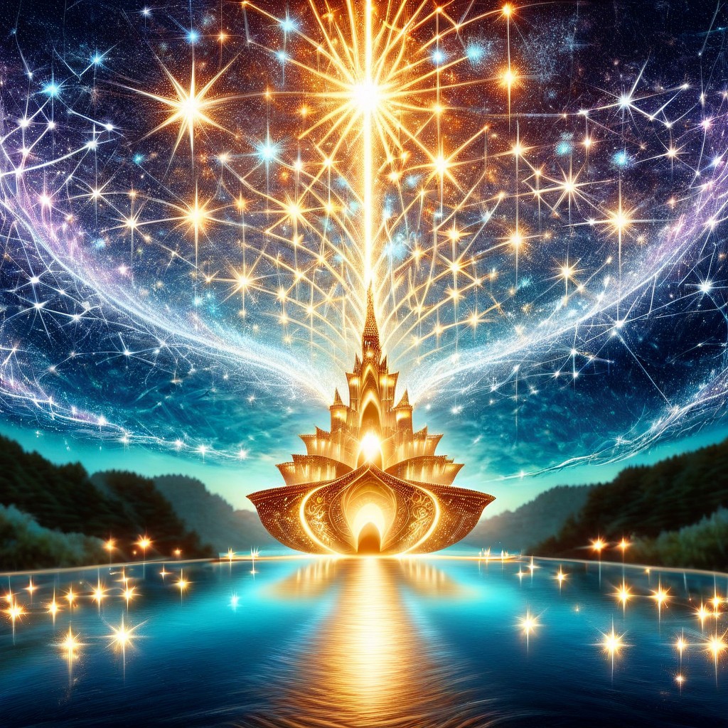 hyper detailed, water horizon, divine tree emerges from water, encircled tree, spiral , golden glow, golden lake, golden dust, sparkles, glitter midjourneyv6.1, starry_morph