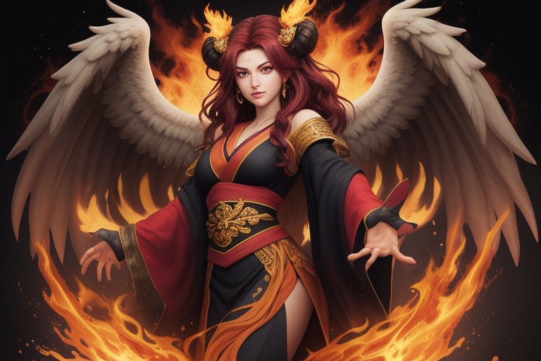 **Appearance:** 1. **Hair:** Fiery red, voluminous waves with gold/orange streaks; hair buns with glowing ribbons. - Moves like fire with particle effects. 2. **Eyes:** Amber with gold glow, pupils like flames/phoenixes; warm, mischievous gaze. 3. **Outfit:** Modern kimono, black with red/gold flame patterns, high slit; glowing sleeves, phoenix crest obi; boots with glowing runes. **Accessories:** 1. **Earrings:** Flame-shaped, glow with movement/emotion. 2. **Headpiece:** Phoenix feather, surrounded by smaller flames/feathers. 3. **Gloves:** Fingerless, black with glowing runes for "fire goddess" powers. **Theme/Personality:** 1. **Theme:** Phoenix/fire goddess, rebirth, passion, dual nature of fire. 2. **Personality:** Bold, energetic, playful tease, nurturing, dramatic flair. **Additional:** - **Stream Setup:** Phoenix background, animated flames, flame borders in overlay. - **Catchphrases:** "Ignite the passion!", "Rise from ashes!", "Feel the heat!" - **Emotes:** Flickering flame, phoenix wings, playful fireball. This VTuber concept is vibrant and engaging, sure to impress!