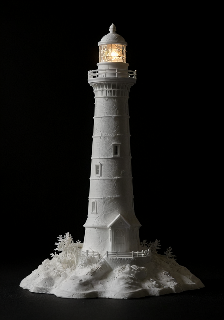 realistic, masterpiece, 4k, 8k, extremely detailed (WhiteMold art style, 3d printed mold, looks 3D printed in a wonderful aesthetic white), 3d lighthouse , cinematic lights, (black background), simple background , , WhiteMold<lora:- SDXL - vanta-black_contrast_V3.0.safetensors:0.4:0.4> <lora:sdxl1.0\3DPrintingXL.safetensors:1.0:1.0> <lora:aidma-Image Upgrader-v0.1.safetensors:0.4:0.4>