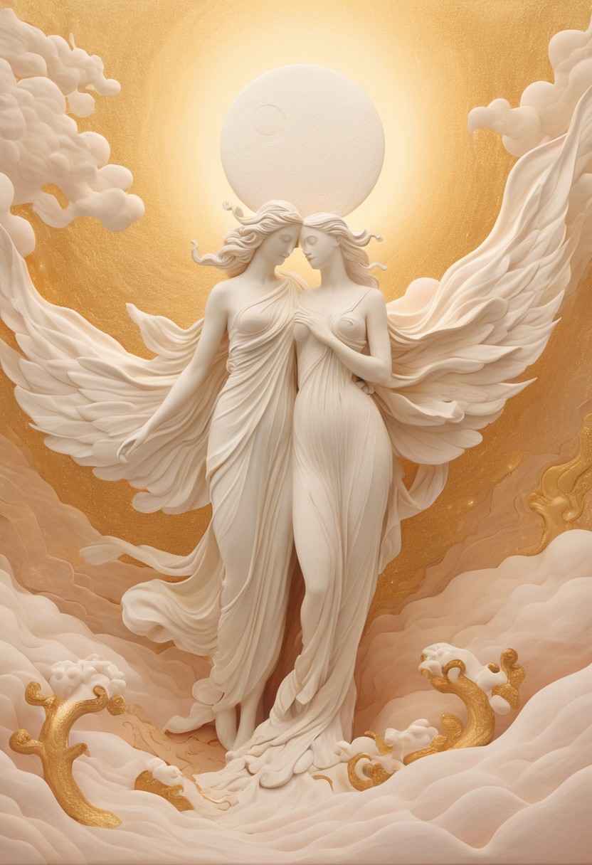 WhiteMold, Modern flat design using soft pastel colors depicts gentle, soothing sculptural mythological figures in a two-dimensional style. The Symbolist realism dreamscape incorporates simple shapes, golden light, and flowing cosmic textures.