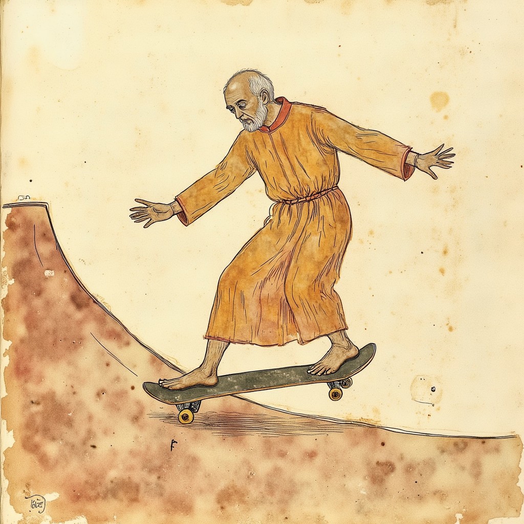 Illuminated manuscript illustration of a man in monk's robes doing a skateboard jump on a half-pipe grabbing the front of his board in mid air
