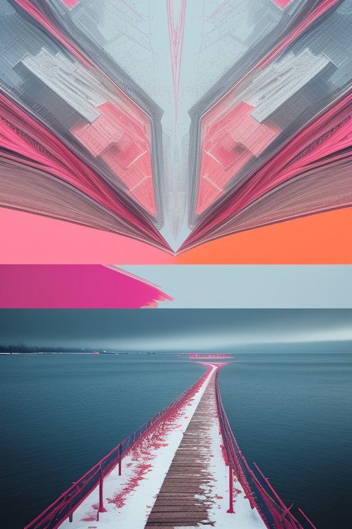 minimalism, abstract, orange, fuchsia, blue, perspective, double exposure, waterfront in winter, surreal, hyper-detailed, intricate details, professional photo, vivid colors, full-scene view