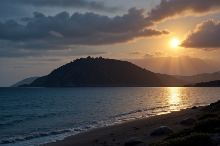 watercolor painting This image is a photograph of a painting, likely an oil painting, depicting a serene coastal landscape at dawn. The scene is dominated by rising sun, casting a soft, golden glow over the water and the surrounding landscape. The sun is partially obscured by thin clouds, adding to the ethereal quality of the scene. The sky is a bright orange, transitioning into a lighter orange near the horizon, where the sunlight creates a subtle gradient., In the foreground, there is a rocky shoreline with rugged, dark rocks and shrubs. To the left, there is a tall, dark silhouette of a cypress tree, adding to the moody atmosphere. To the right of the tree, a small, rustic stone building with a thatched roof is visible, hinting at a coastal village. The water in the middle ground reflects the sunlight, creating a shimmering path that leads to the horizon. The overall mood of the painting is peaceful and contemplative, with a focus on the interplay between light and shadow. . vibrant, beautiful, painterly, detailed, textural, artistic