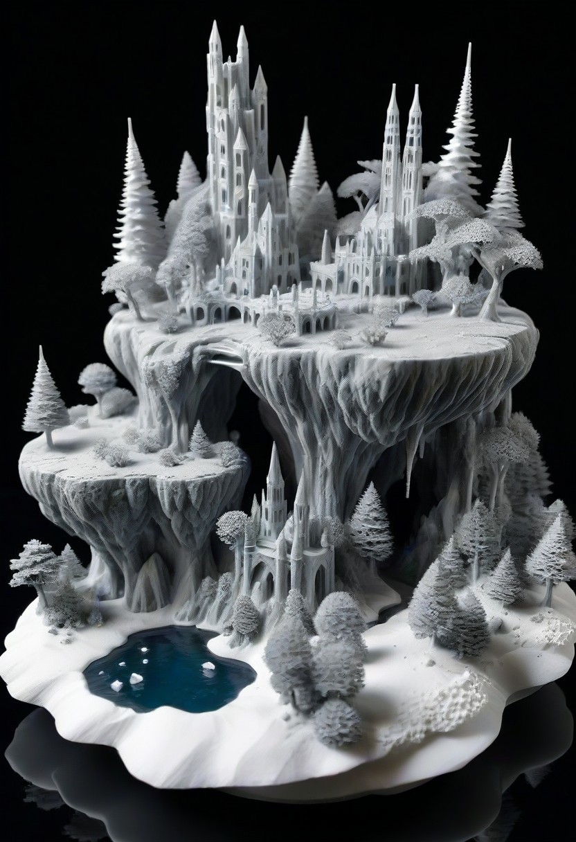 score_9, score_8_up, score_7_up, best quality, masterpiece, 8k, ultra detailed, intricate detail, realistic photography, digital painting art style, intricate details, ultra sharp, exquisite detail, vivid colors, exciting background, ultra detailed background, BREAK, crystals, towers, cities, forests, ocean, on floating island, WhiteMold, 3d printed mold, greyscale