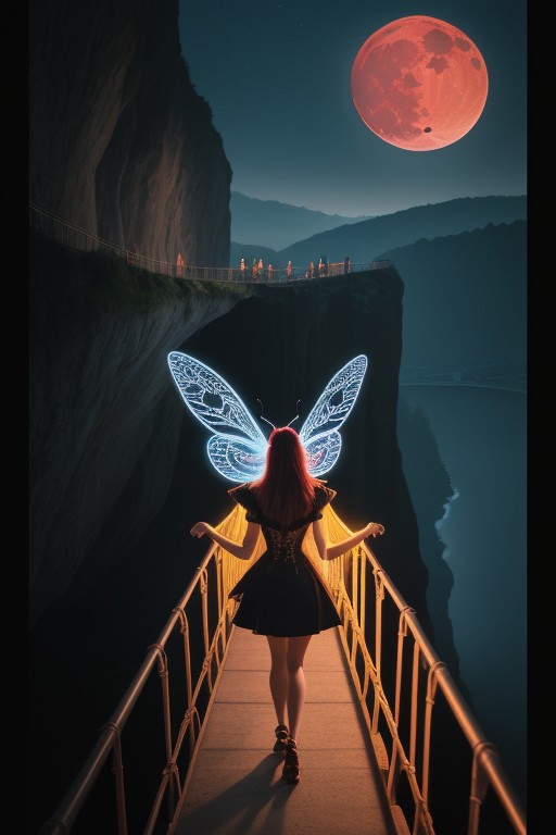 mega beautiful neon butterfly suspension bridge on the night cliff, beautiful girl walking on the bridge, rich colors, play of colors, fairy tale landscape, red moon, stardust, rainbow, macro, detail drawing, realistic, intricate details, hyper-detailed, kodak 50mm lens, professional photoshoot, full-hight scene view, intricate details, vivid colors, 50mm lens, octane rendering, professional photoshoot