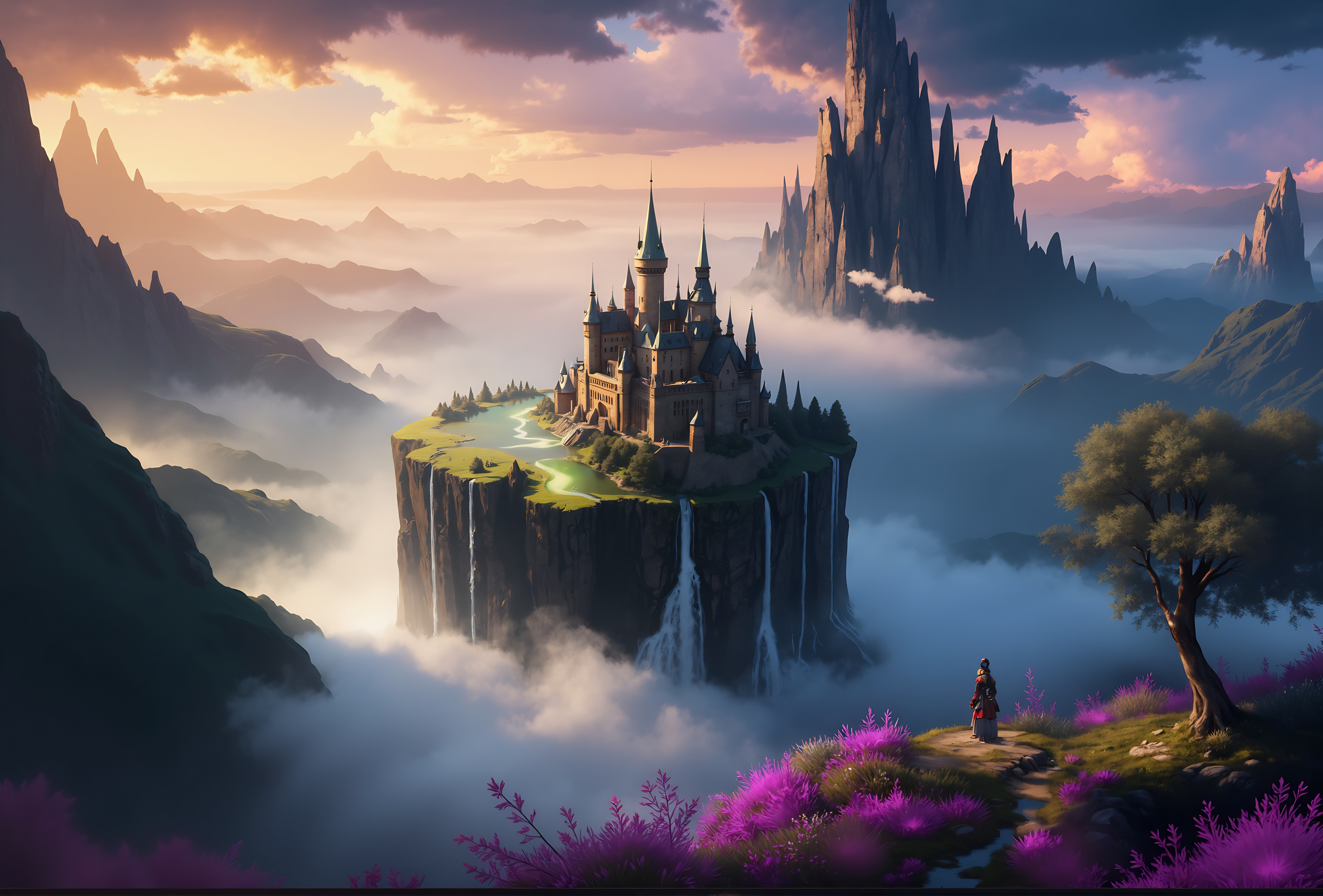 High above the clouds: ancient fortress (white marble, dark steel) atop a floating island; its towering spires, creeping ivy; golden banners fluttering in the wind. BREAK Below, endless waterfalls spill off the edges of the island, cascading into the sky itself, shimmering rivers, glistening spray, mist. BREAK sky all around gradient colour blue-violet-red-orange BREAK Winged sentinels, silver armor, magical silver spears crackling with raw energy BREAK above the atmosphere, a ringed planet BREAK fantastical dramatical scene, 64k resolution depth of field clear focus best quality vibrant colours deep colour