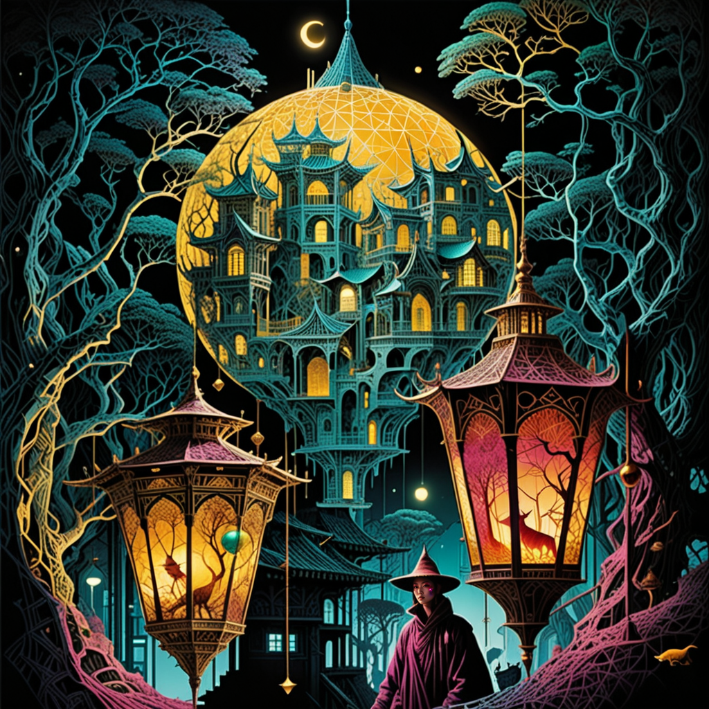 Double Exposure photography, (Compressed Photo:1.3) of (Illustration:1.3),(Disgusting:1.3) Carolina Blue, intricate, polygon, elements, Ebony, Emerald, Ruby, Sapphire, Silver, Amethyst, Mosaic, Animal, Fractal, Person, Branches, wool, Golden Silk: Silk dyed with natural yellow dyes to achieve a golden hue.,Night Watch Lantern: A lantern used by night watchmen to patrol dark streets and alleys, casting eerie shadows. <lora:castlesland:1> castlesland,(by Artist Victo Ngai:1.3),Highly Detailed,(Ascii Art:1.3),(Magenta hue:1.3), double image ghost effect, image combination, double exposure style