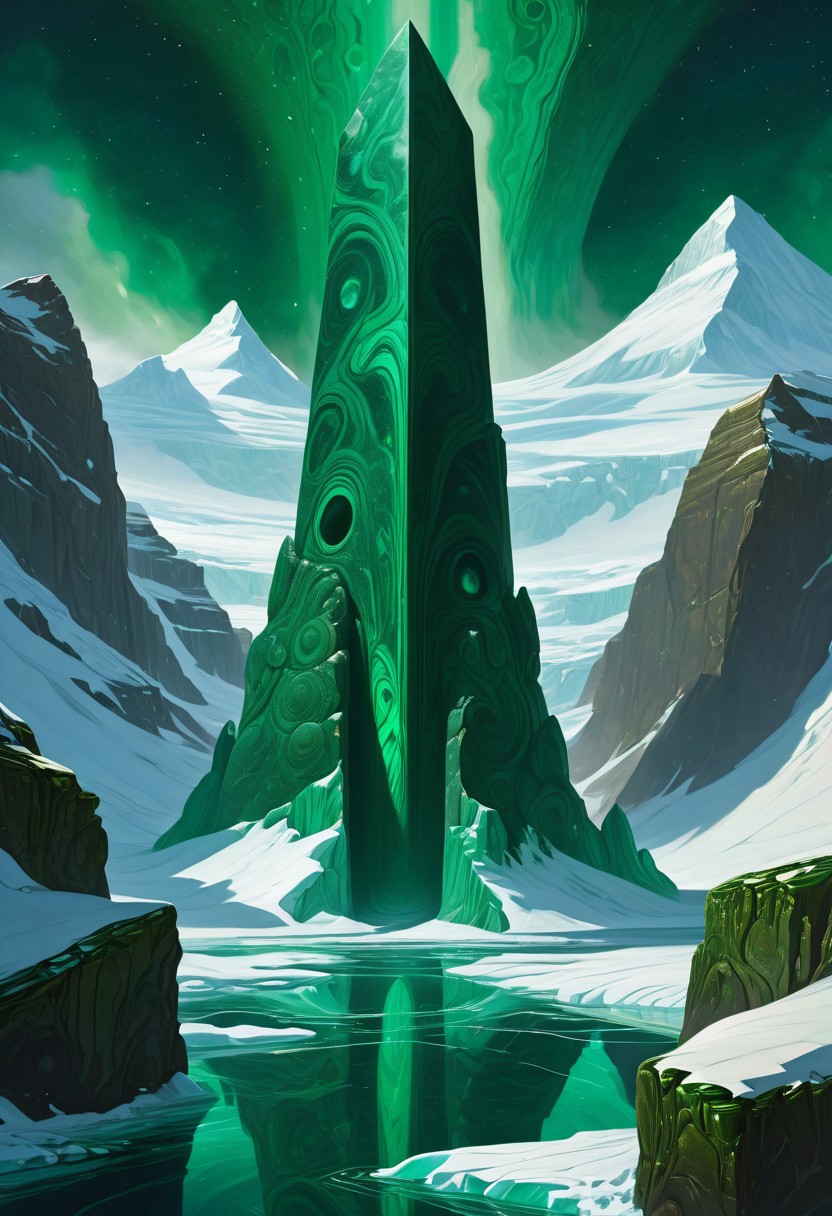 The lovecraftian depiction of the unimaginable inevitable endless cosmic horror coming from the deadly void of space in the form of the giant irritating ethereal indescribable ancient non-euclidean monolith as a shadow of the unknown vanished civilization hidden in the cold antarctic dreadful valleys, high quality, detailed, intricate details, masterpiece, malachite style