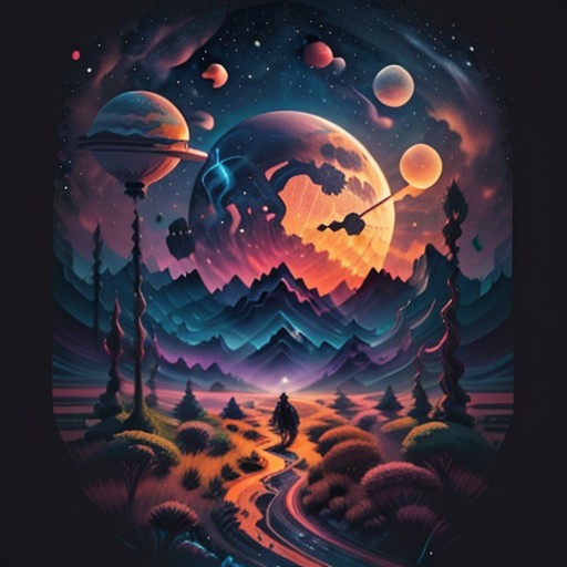flat illustration surreal, floating islands, melting clocks, cosmic colors, imaginative dreamlike landscapes, fantasy surrealism, trippy visuals, Masterpiece, High quality, RAW, detailed, volumetric light, dramatic lighting, backlight, plan background, tshirt design, simple background, flat background