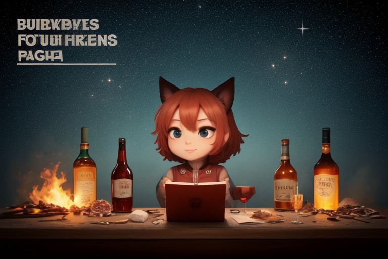 ((chibi)), sparkles, food, machine, mouse, cat, war,, bullets, gun, rpg, blood, fire, waste, trash, (lunar surface background), building, beer, vodka, whiskey, scotch, blood, fight, ((((drunk)))), journal cover, text, (((big text))) r5b6r56bb