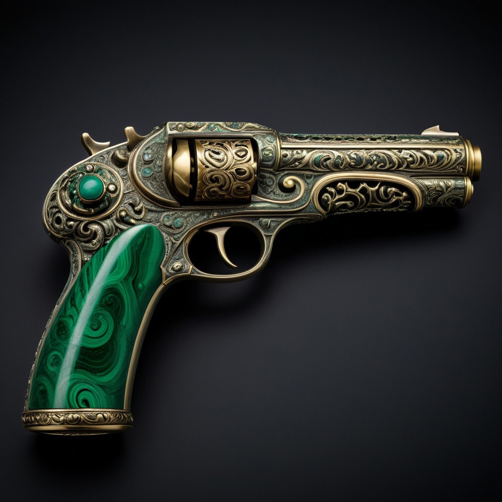 A highly detailed flintlock pistol intricately crafted from malachite, deep green hues with swirling natural patterns, polished stone texture with subtle imperfections, ornate gold and silver engravings on the barrel and trigger, intricate filigree details, dramatic lighting with strong highlights and deep shadows, cinematic composition, high-resolution, studio photography setup, historical weapon craftsmanship. malachite_style