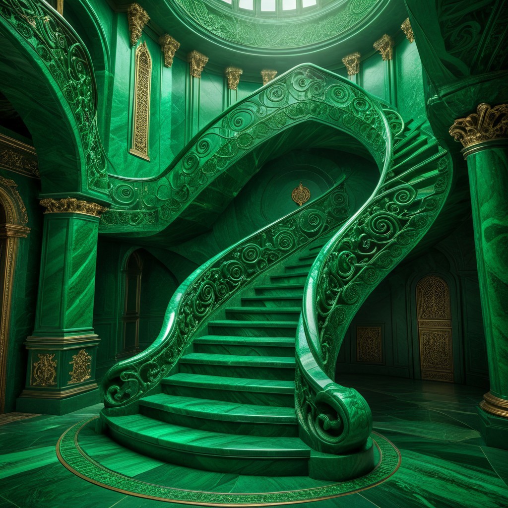 A breathtaking set of ornate spiral stairs intricately carved from malachite, deep green hues with swirling natural patterns, polished stone surface with subtle imperfections, delicate filigree and baroque-style engravings along the railing, the staircase gracefully winding upward into the clouds, surrounded by mist and soft ethereal light, dramatic lighting with strong highlights and deep shadows, cinematic composition, high-resolution, fantasy architecture, surreal atmosphere. malachite_style