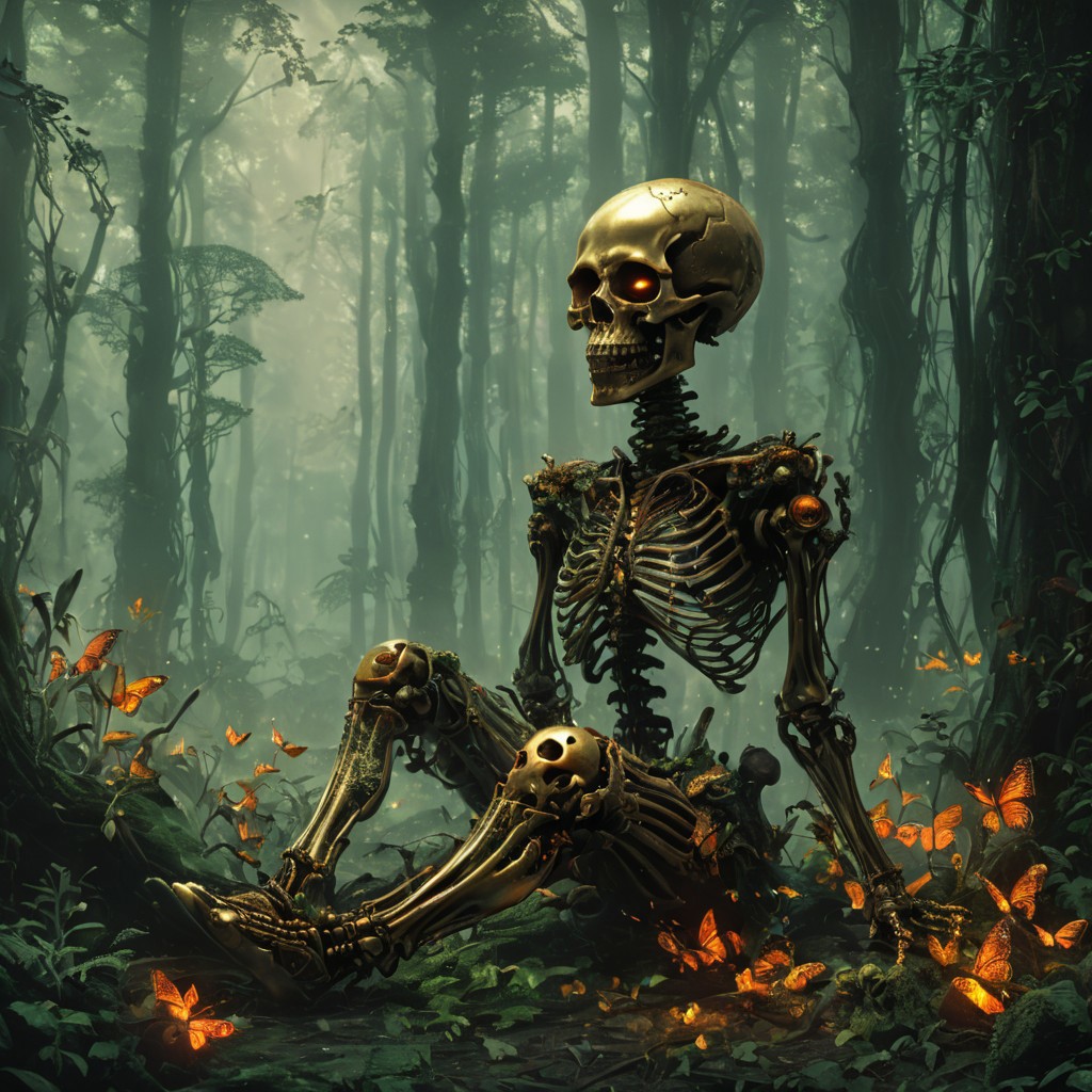 masterpiece, best quality, good quality, very awa, newest, highres, absurdres, ,score_9, score_8_up, score_7_up, alienworld, The image portrays a surreal and gothic scene of a skeletal figure sitting against a wooden structure in a misty forest. The skeleton is dressed in an ornate, dark outfit with intricate gold and blue embellishments on the chest. Its skull features delicate engravings, adding an artistic and mystical touch. The figure holds a vibrant orange butterfly in its fingers, with more butterflies fluttering around, symbolizing transformation and contrast between life and death. The forest is lush with flowers, moss, and soft lighting filtering through tall trees, creating an eerie yet peaceful atmosphere. photorealistic, cinematic lighting, concept art, octane render, unreal engine 5, Very detailed, vibrant colors, 3d, malachite_style