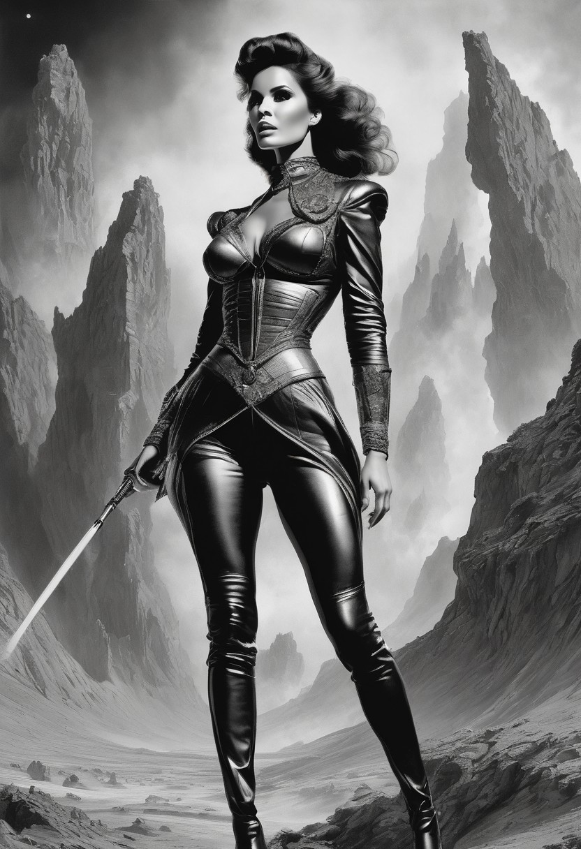 raquel welch black and white pin and ink art style of Norman Lindsay, wasp waisted, hourglass figure, Golden Ratio Perfect Composition standing on a alien planet from a 1950's science fiction movie, full view, full shot, art Nouveau, baroque, romanticism, airbrush art, 4K, elaborate, complex, epic, atompunk, raypunk, Breathtaking celestial background with nebulas and stars visible,