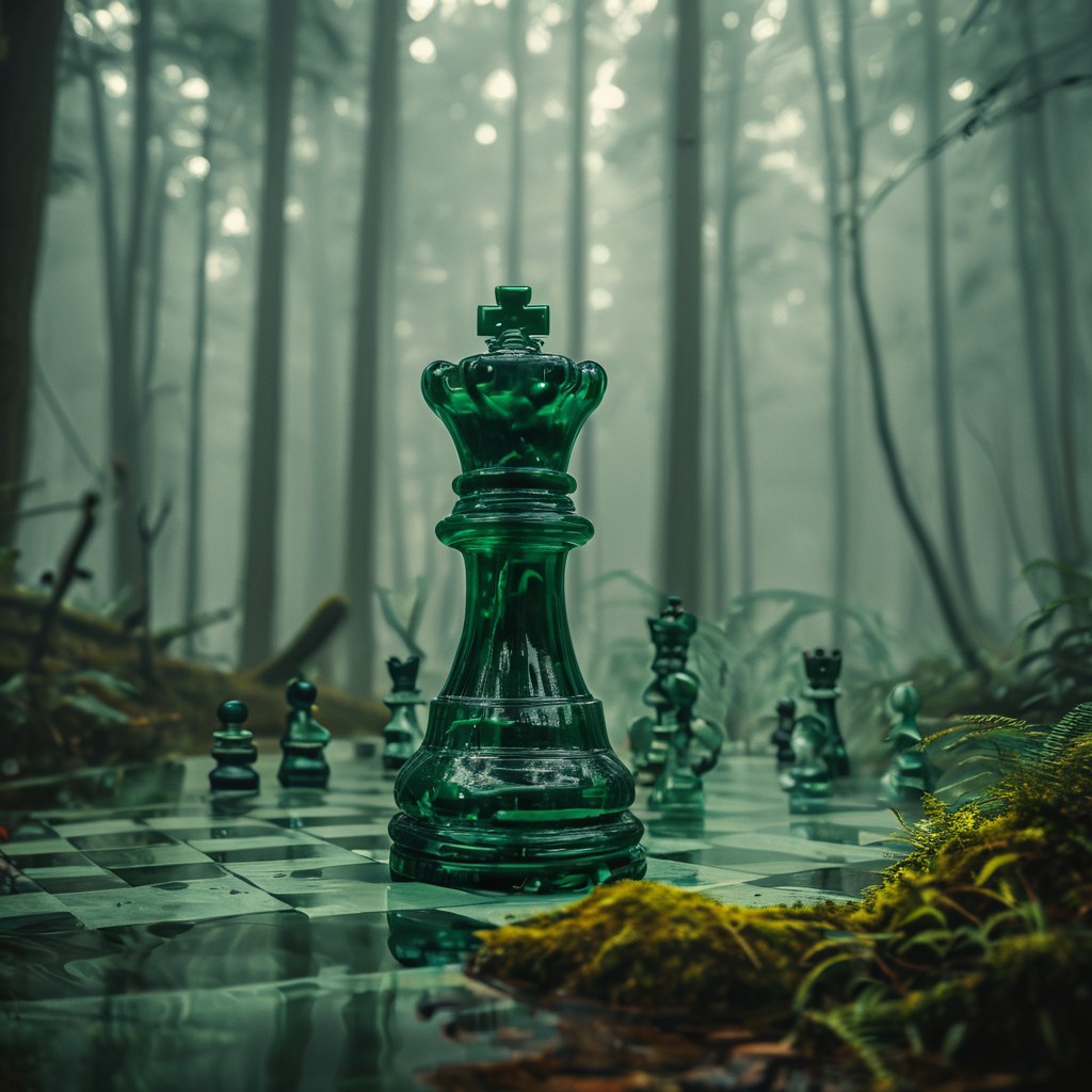 alienworld, giant chess piece, depth of field, bokeh, forest, acid water, distorted mist, chess piece with arms