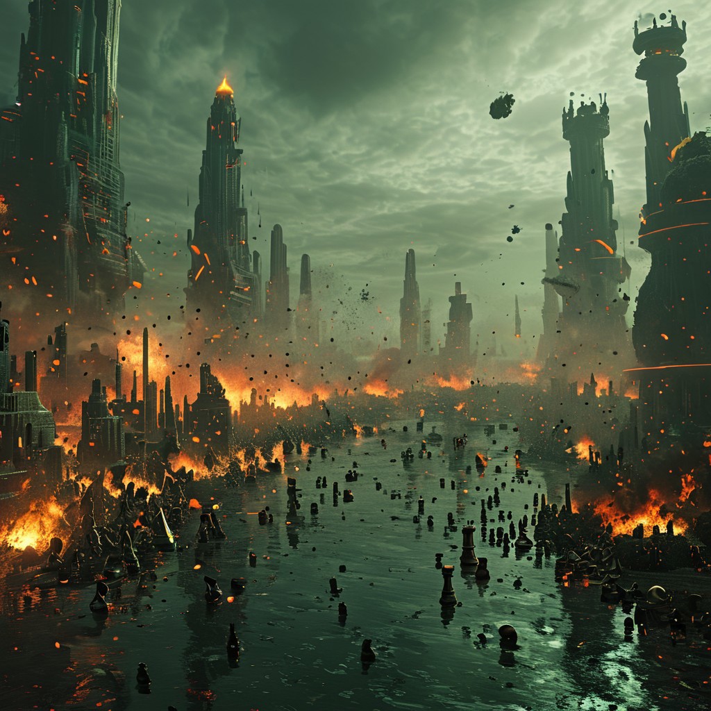 alienworld, flying chess pieces, distorted mist, city high tech, floating city, explosions