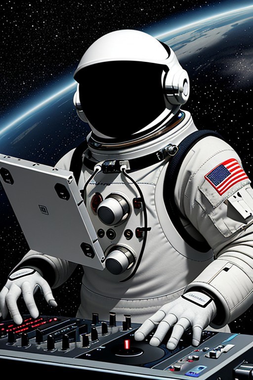 This is a stylized black and white illustration of an astronaut in space. The astronaut is wearing a spacesuit with a helmet, which has reflective visors showing the stars. The suit includes intricate details such as gloves, communication devices on the shoulders, and a camera attached to the chest. In front of the astronaut are two DJ turntables and a mixer. The astronaut's hands appear to be operating the equipment, suggesting that they are engaged in some form of music mixing or DJing. This creates a unique blend of space exploration and musical creativity within the same visual theme. The background features a starry sky, enhancing the cosmic atmosphere. The overall design combines elements from science fiction and modern culture, creating an imaginative scene where the boundaries between different realms are creatively merged.