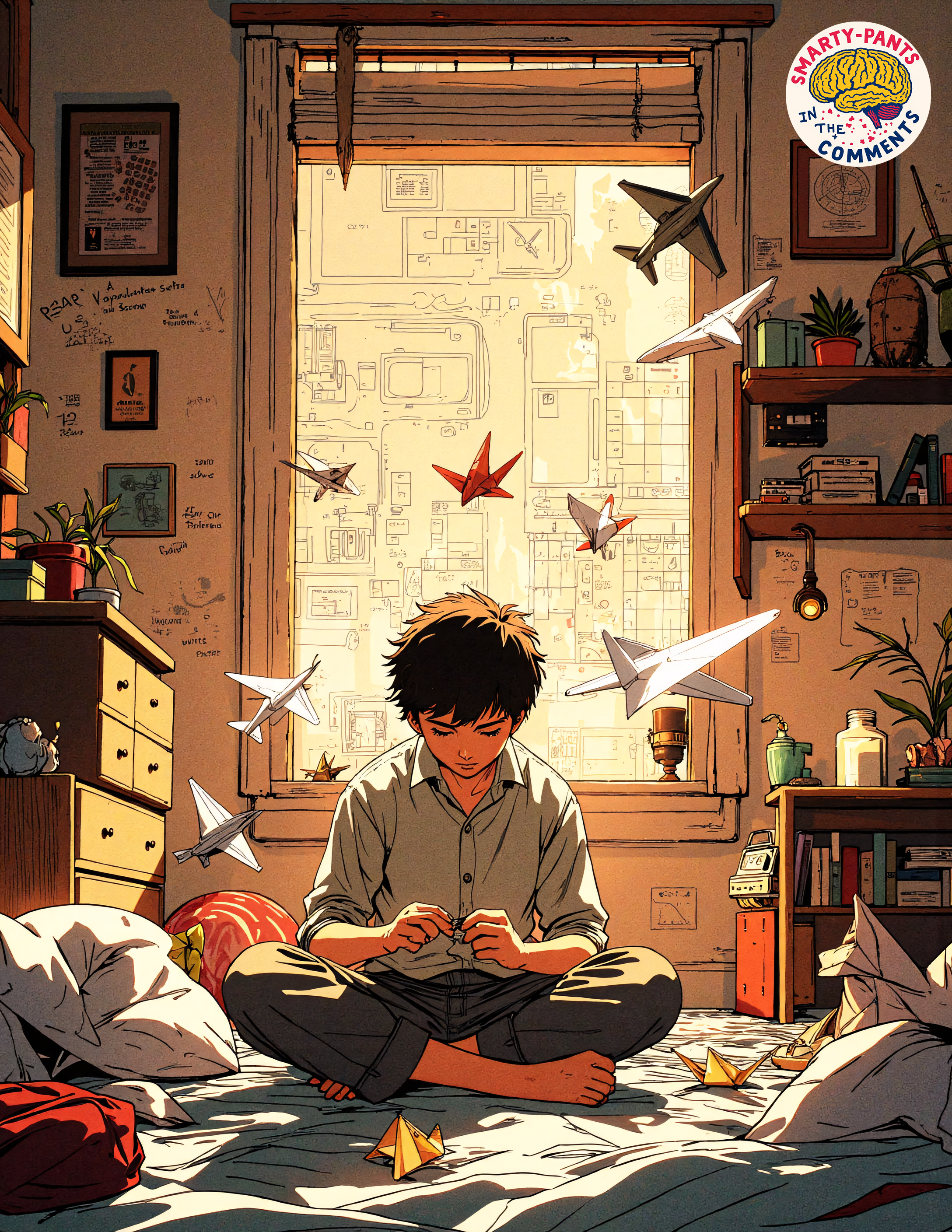 A young boy sits cross-legged in his bedroom, completely immersed in folding a tiny paper aeroplane. Around him, his small room is filled with towering paper jets and origami gliders of all shapes and sizes. Blueprints cover the walls, scribbled with experimental aeroplane designs. The art style is detailed anime with soft, warm lighting and a cinematic depth-of-field effect.