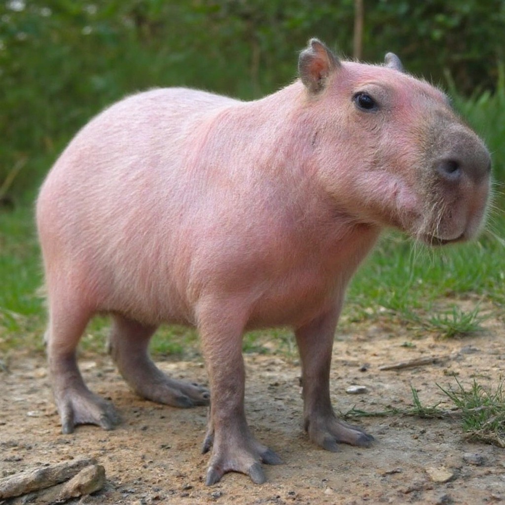 h41r73ss 4n1ma7. A completely hairless capybara with pink skin in it's natural habitat, Nature documentary in the style of National Geographic or BBC Planet Earth.