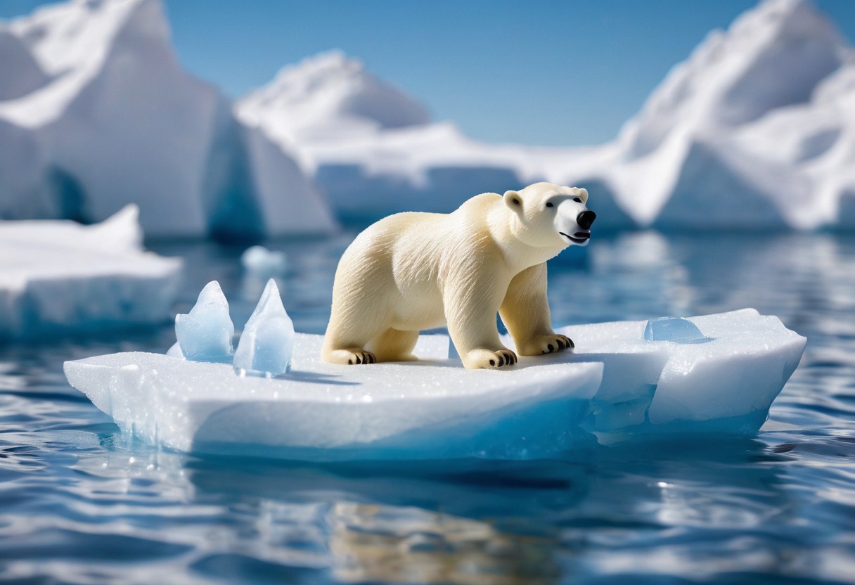 novuschroma53 style, polar bear and bundled person on a floating iceberg, winter, water, Toy Photography, high quality, detailed, realistic