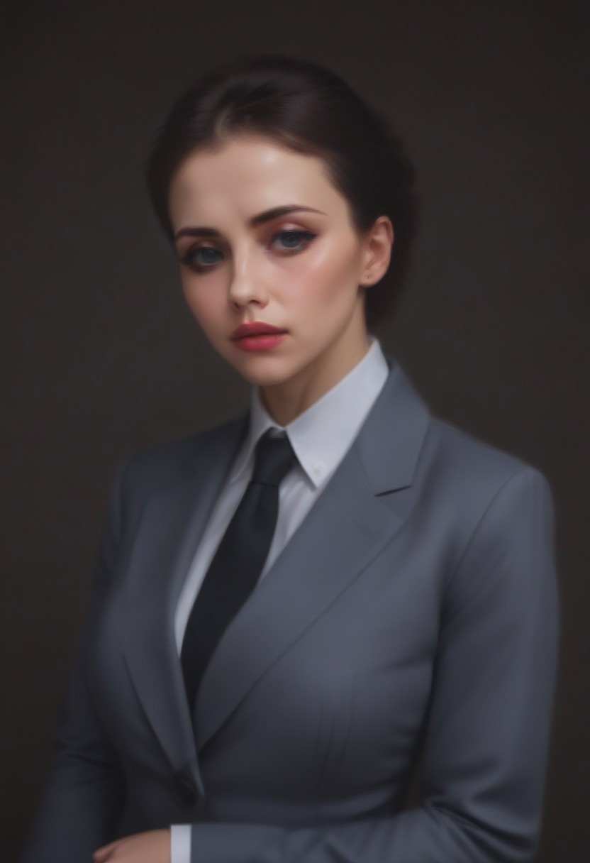 Bold Pixie hair, terminator, robot, cyborg, raven black hair, goth makeup, plump lips, small nose, thin nose, busty, tight mafia boss business suit, deep cleavage, charming, crossed armes pose, muscular, detailed, full body shot, style of malcolm liepke