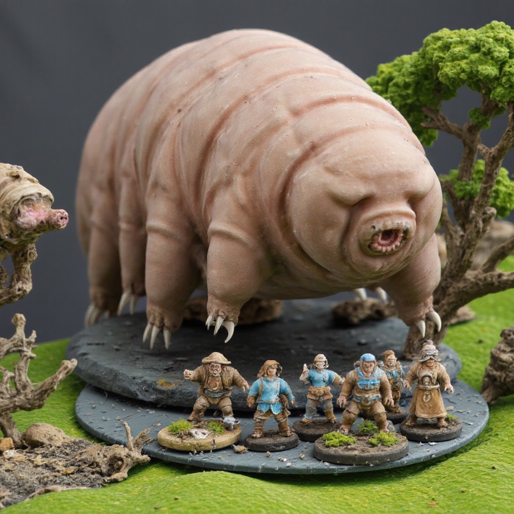 aidmaTableTopMiniatures, a tardigrade on a large base, a large monster model, placed in tabletop gaming terrain and facing several mixed Adventurer miniatures of smaller size