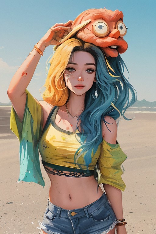 illustration in style of samdoesarts, a female character with a fair skin tone and long, flowing, sunset-colored hair, transitioning from deep red at the roots to golden blonde at the tips, styled in loose, beachy waves with a few strands framing her face, and a pair of brightly colored, paint-splattered sunglasses resting on her head. Her eyes are a warm, sparkling amber, radiating a mix of playful charm and creative passion, her gaze both inviting and reflective. She wears a bohemian-inspired outfit, featuring a flowy, off-the-shoulder top with paint splatters and intricate patterns, ripped denim shorts with paint stains
