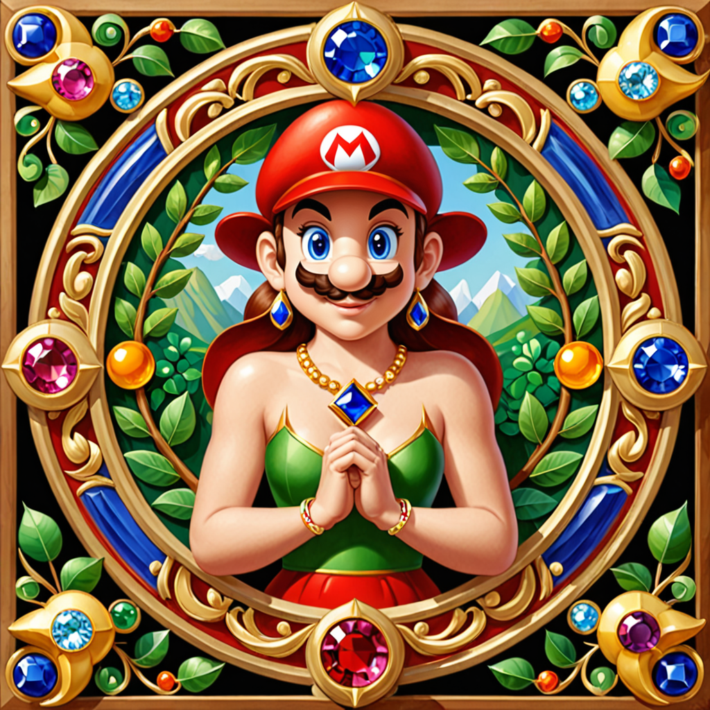 Super Mario style art of (Simple Digital Artwork:1.3) of (Illustration:1.3),(Lustful:1.3) Sienna, symmetric, elements, Ebony, Ivory, Emerald, Sapphire, Amber, Gold, Bronze, Diamond, Topas, Amethyst, Mosaic, Ring, Person, Object, Frame, Branches, wool, embroidery, Red Ochre: A natural clay earth pigment used in ancient art and decoration.,Puzzle Lock: A lock that can only be opened by solving a complex puzzle or riddle.,Webbed Feet: Toes connected by skin, as seen in ducks and frogs, aiding in swimming. <lora:add-detail-xl:1>,(by Artist Tarsila do Amaral:1.3),CGSociety,ArtStation,(Afrofuturism:1.3),(Provia:1.3), Vibrant, cute, cartoony, fantasy, playful, reminiscent of Super Mario series