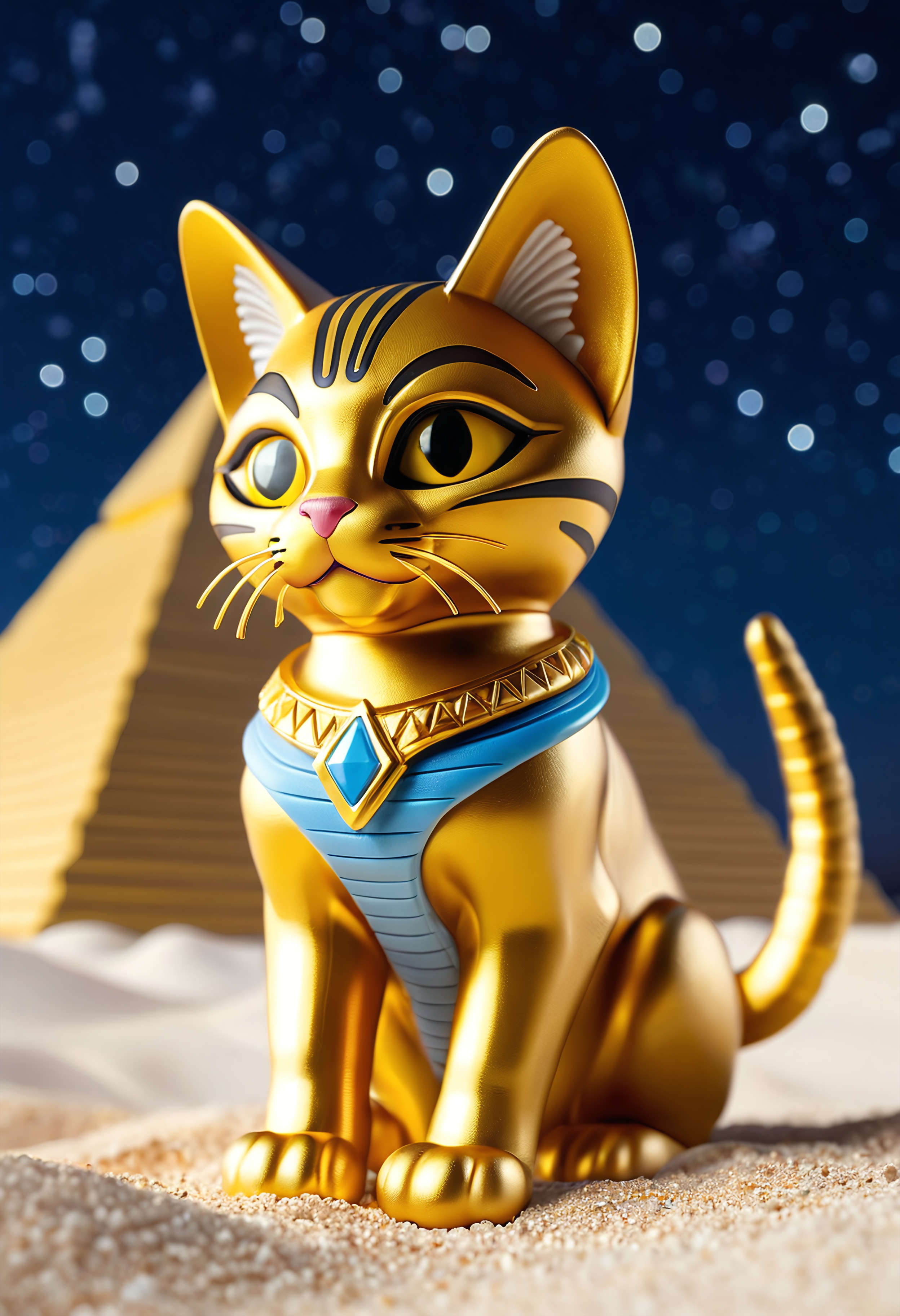 <lora:novuschroma53 style:1> novuschroma53 style, intricate details, depth of field, gold painted sphinx toy made of plastic, style of a beckoning cat, glowing eyes, under the starry sky, white sandy dessert, pyramid background. <lora:detailed_notrigger:1>