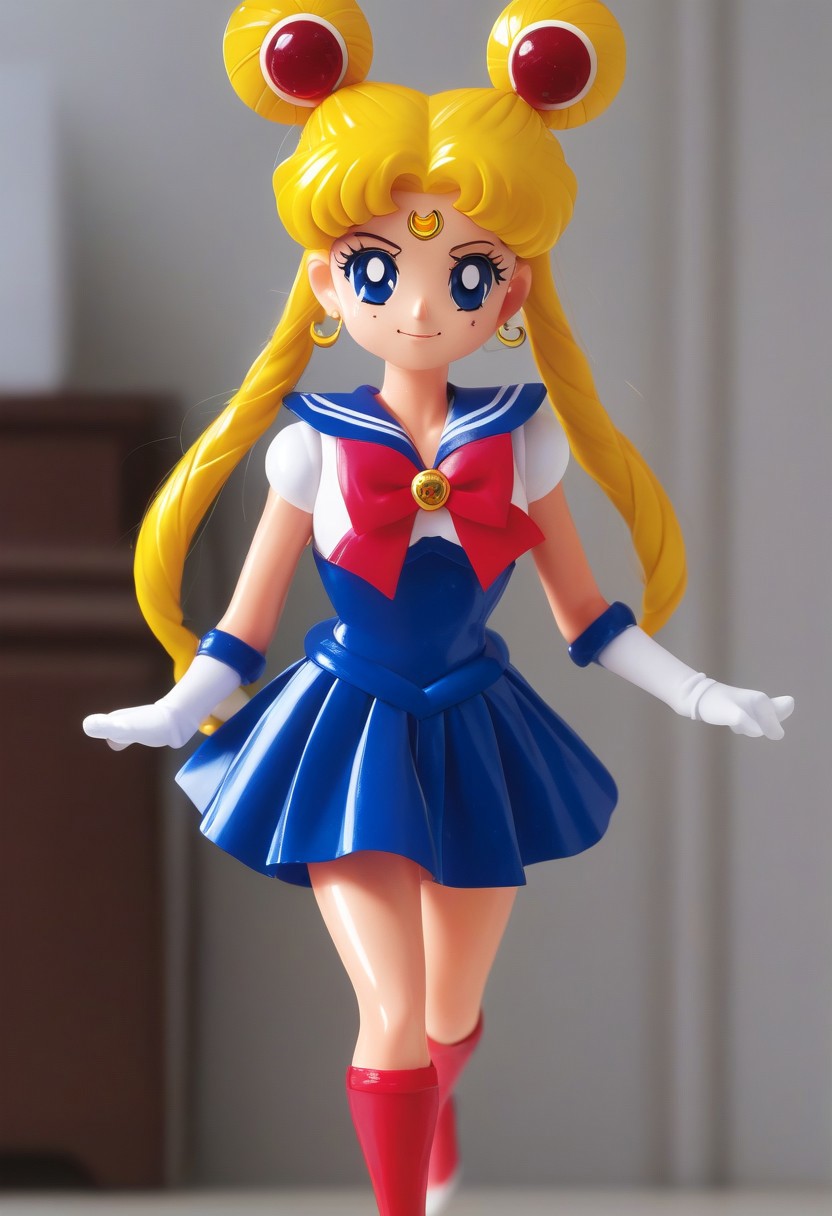 1girl, aausagi, long hair, double bun, twintails, parted bangs, tiara, earrings, blue eyes, red choker, blue sailor collar, red bow, white shirt, elbow gloves, white gloves, blue skirt, best quality, plastic toy world, Usagi Tsukino executing a spinning kick, skirt and hair flowing dramatically, front-view shot, vibrant and playful, glossy plastic shine, <lora:novuschroma53 style:1>, novuschroma53 style