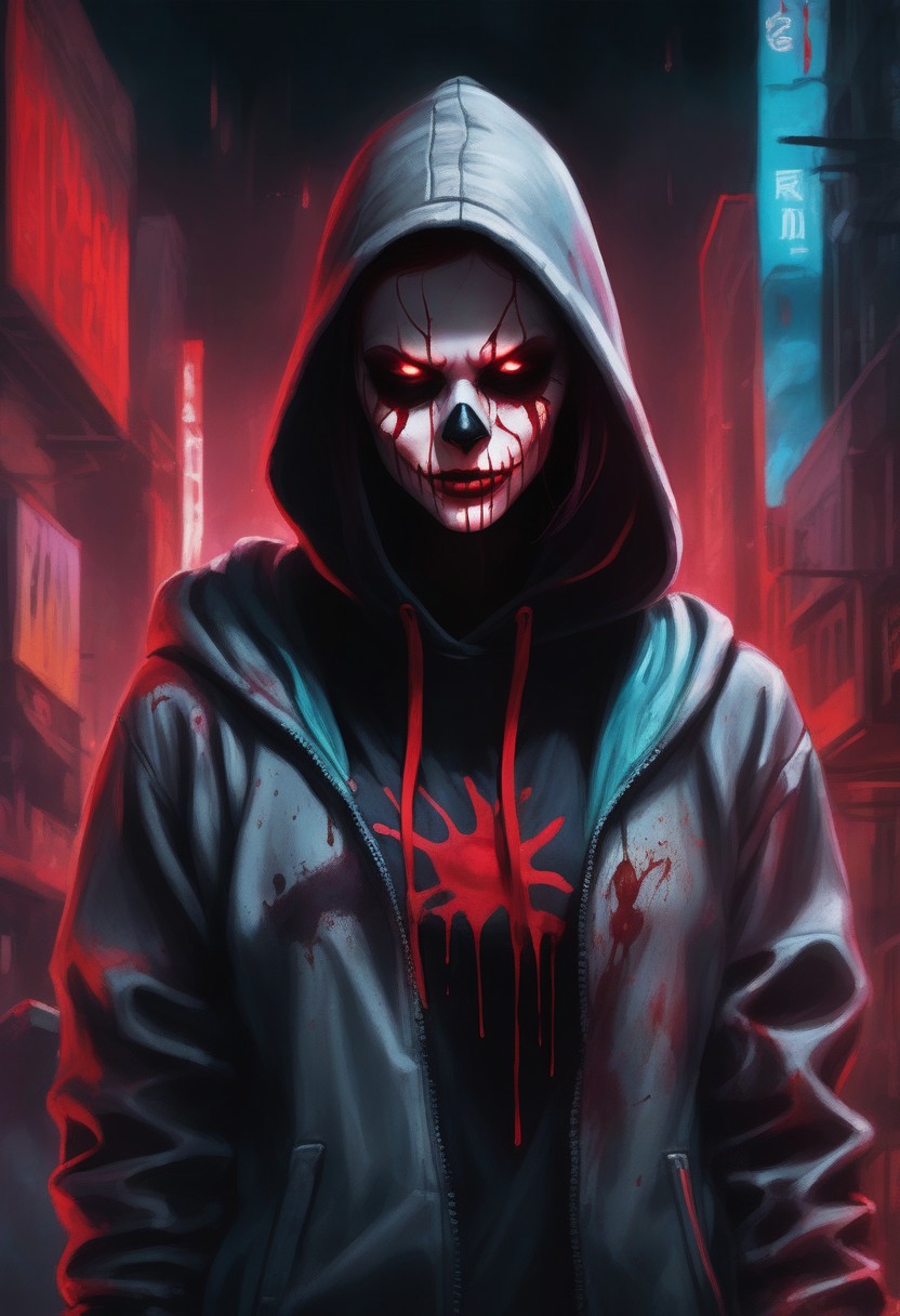 Super hero art, teenage heroine, girl, female, her powers are focused around blood, pain and bones. she can extract bones from her body to create deadly body extensions, can manipulate the blood, and deal or prevent pain. Promo image, at night, neon city. bruises, mutaded bones from body, floating blood. Wearing hoodie, black hoodie, skeleton hand with sharp like knifes fingers, mask of a clown skull, dark fantasy art, floating blood drops sharp like knives, long blood red hair, massive hairstyle, boney wings with blood