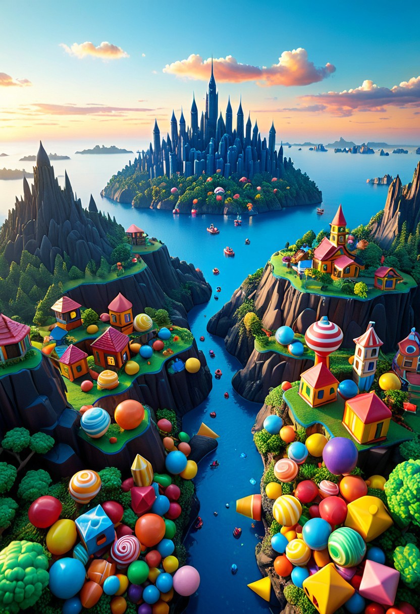 A surreal, towering world made entirely of plastic toys, stretching beyond the horizon. Gigantic toy buildings, molded from candy-colored polymer, form an endless, shifting landscape. The inhabitants, lifelike yet artificial, move with an eerie smoothness, unaware of their synthetic nature. Floating puzzle-piece islands, suspended in an unseen child's imagination, rearrange themselves as if playing an infinite game. The sky flickers, glitching between day and night. Ultra-detailed, hyper-realistic, cinematic lighting, 8K, octane render, unsettling toy utopia, eerie artificial life, dreamlike yet synthetic. novuschroma53 style, rp_slgd