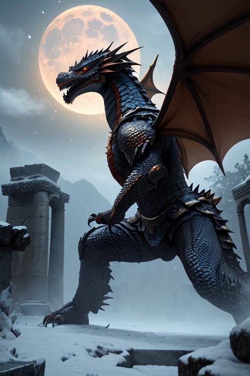 Amidst the ruins of an ancient Nordic tomb, a lone Dragonborn warrior stands defiantly against a colossal, ancient dragon. Snow and dust swirl through the air as the dragon, covered in jagged obsidian scales with glowing runes etched into its body, unfurls its massive wings, shaking the very foundation of the tomb. Its piercing yellow eyes lock onto the warrior as it roars, sending a shockwave through the crumbling stone pillars and frost-covered statues. The Dragonborn, clad in rugged Nordic armor, grips a flaming greatsword, its blade crackling with arcane energy. The warrior’s stance is firm, ready to unleash a mighty Thu'um, the ancient words of power resonating through the battlefield. Wisps of blue spectral energy swirl around the ruins, remnants of lost souls bound to the tomb. Above, the moonlight pierces through the cracked stone ceiling, illuminating the battlefield as legend and destiny collide in an epic battle of fire, steel, and dragon’s wrath.